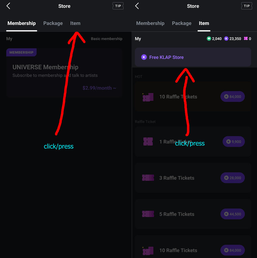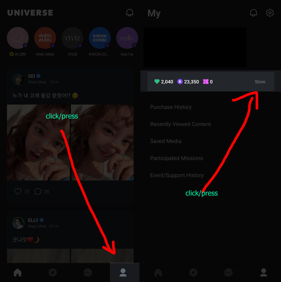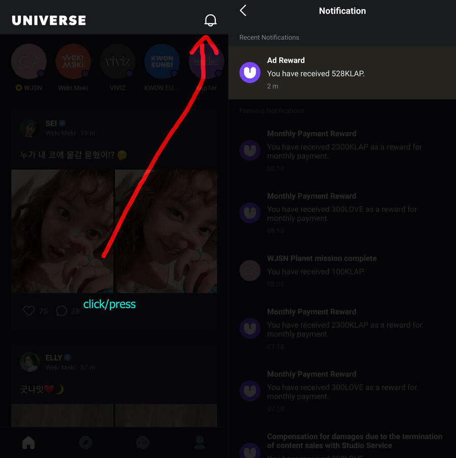 As of June 2022, Universe has removed the option to purchase videos using KLAP, forcing you to pay a minimum of 2.99 USD/month as a subscription. The description below is no longer applicable.Universe uses two (2) types of virtual currency. One is called KLAP –the purple, circular one. The other is called LOVE –the green ones, shaped like a heart. Both KLAP and LOVE can be used to purchase video or image content on Universe.The main difference between them is that LOVE is more valuable than KLAP, so it is used for more "VIP" content –especially right after new content is released.After a certain amount of time (13 days/13일), KLAP can be used to purchase the same content, but you cannot do it as soon as those with LOVE. This is why you can earn free KLAP but not free LOVE.